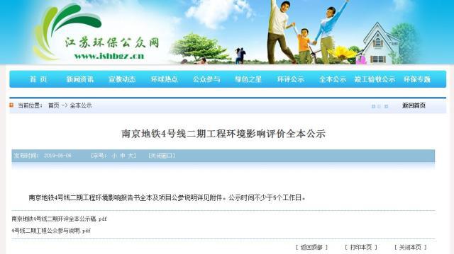 6月,江苏环保公众网对南京地铁4号线二期工程进行全本公示。